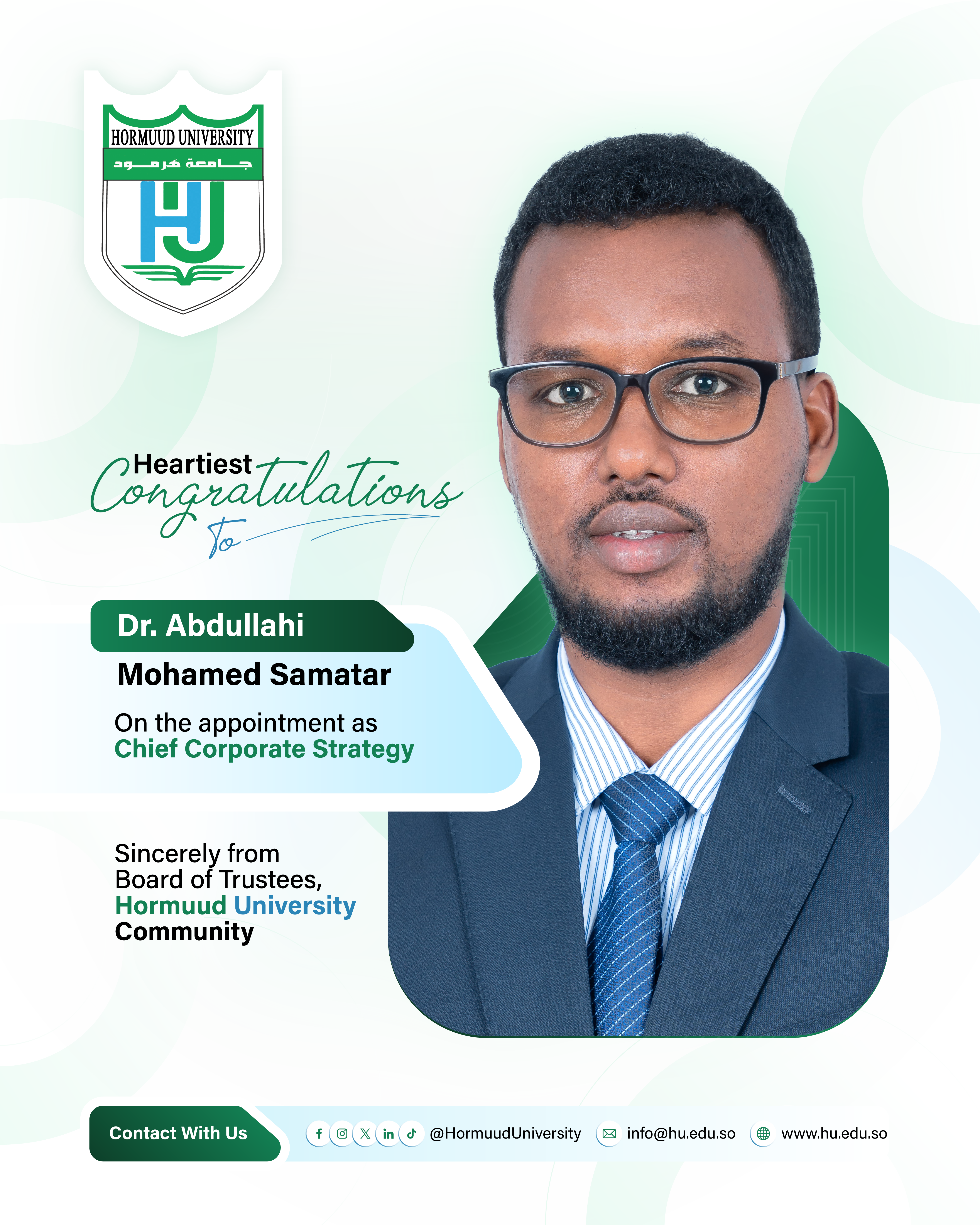 Hormuud University is pleased to announce the appointment of ๐๐ฟ. ๐๐ฏ๐ฑ๐๐น๐น๐ฎ๐ต๐ถ ๐ ๐ผ๐ต๐ฎ๐บ๐ฒ๐ฑ ๐ฆ๐ฎ๐บ๐ฎ๐๐ฎ๐ฟ as Chief Corporate Strategy. Through his outstanding contributions, proven leadership, and strong commitment to our institutional vision, ๐๐ฟ. ๐ฆ๐ฎ๐บ๐ฎ๐๐ฎ๐ฟ brings clarity, direction, and purpose to our mission. His strategic insight and dedication continue to inspire our community, shape the university’s future, and drive meaningful progress at all levels.