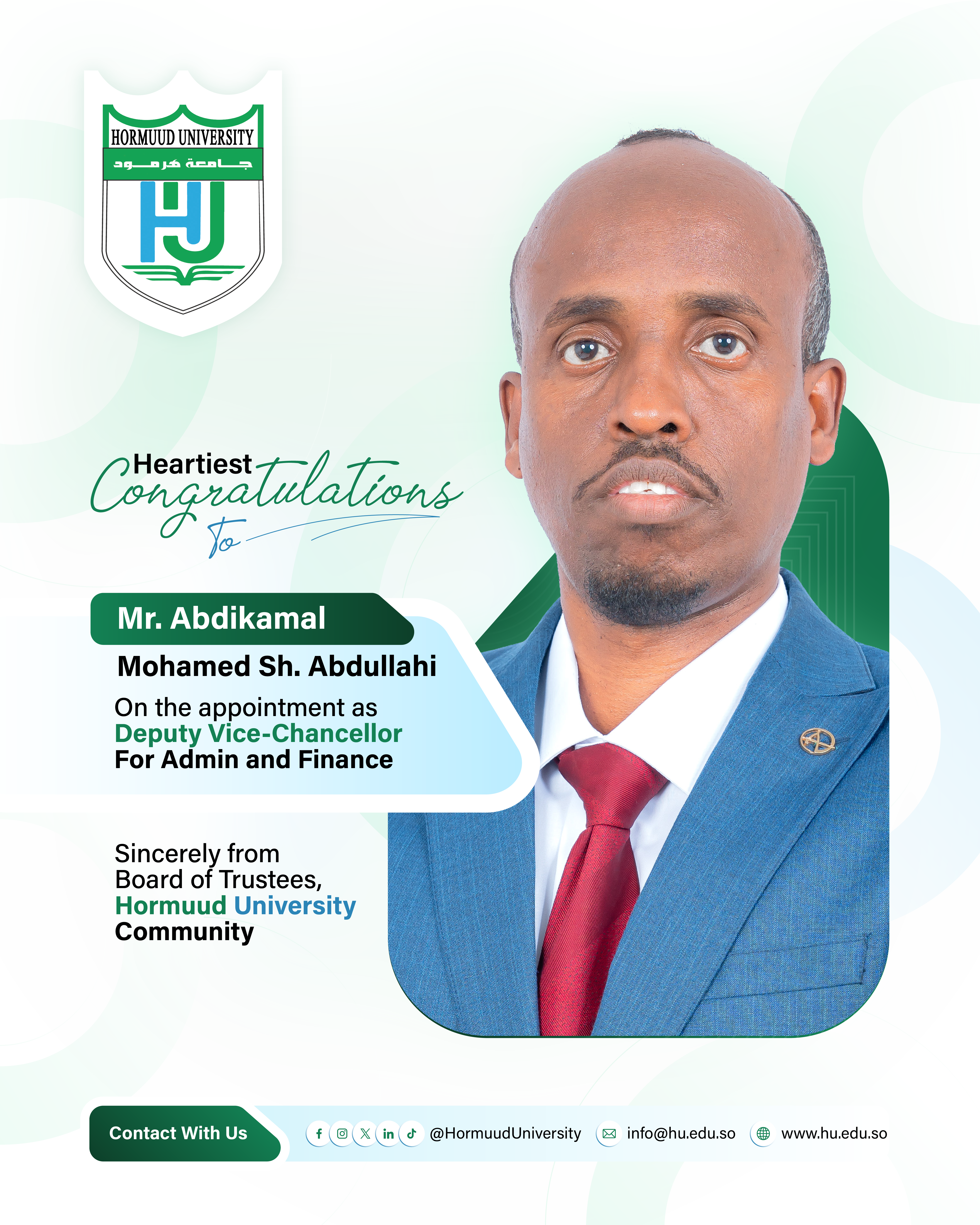Hormuud University is pleased to announce the appointment of ๐๐ซ. ๐๐ฏ๐ฑ๐ถ๐ธ๐ฎ๐บ๐ฎ๐น ๐ ๐ผ๐ต๐ฎ๐บ๐ฒ๐ฑ ๐ฆ๐ต๐ฒ๐ถ๐ธ๐ต ๐๐ฏ๐ฑ๐๐น๐น๐ฎ๐ต๐ถ as the new Deputy Vice-Chancellor for Administration and Finance. With a strong background in administrative leadership and financial management, ๐๐ซ. ๐๐ฏ๐ฑ๐ถ๐ธ๐ฎ๐บ๐ฎ๐น will lead efforts to improve efficiency, optimize resources and support the university’s growth.