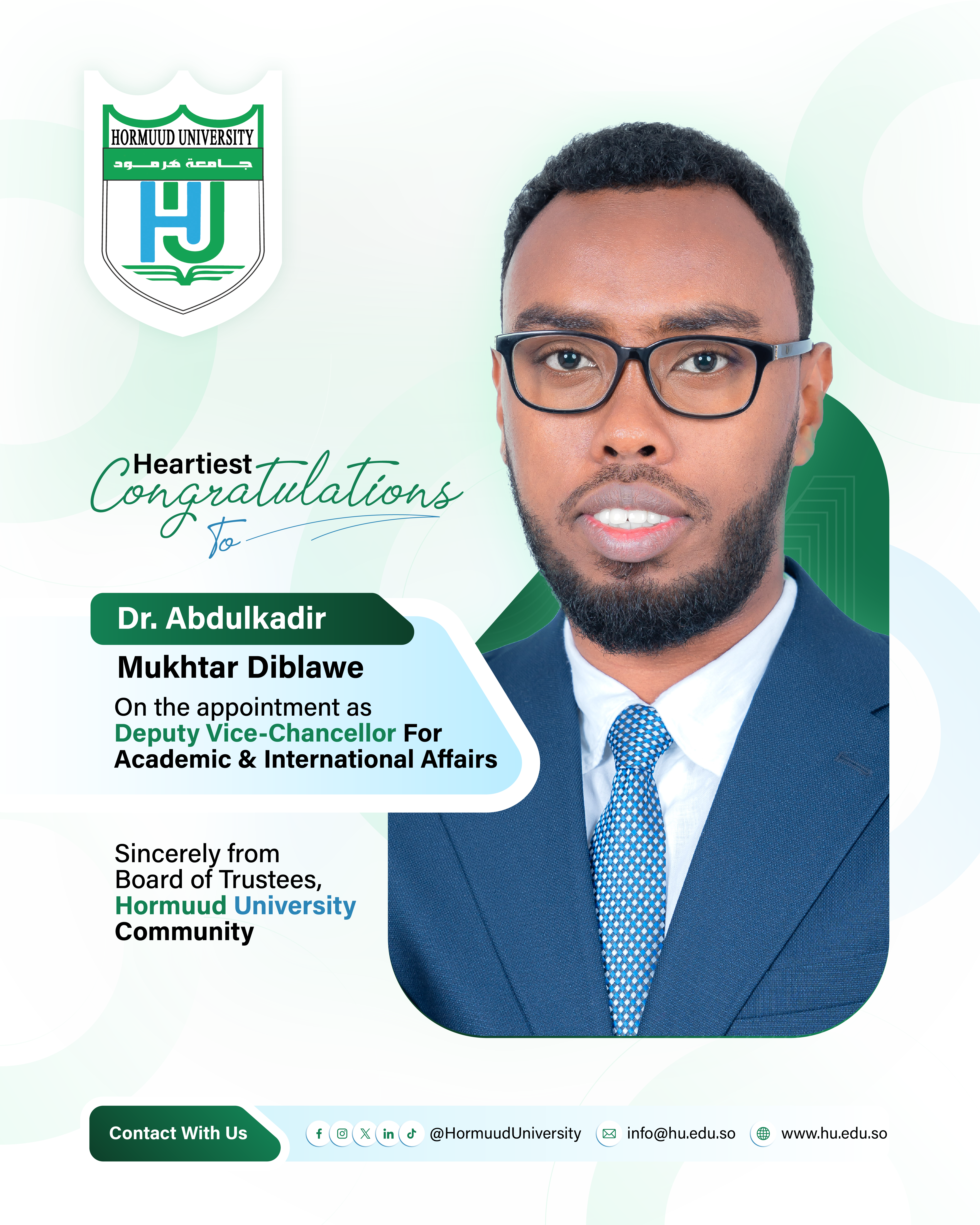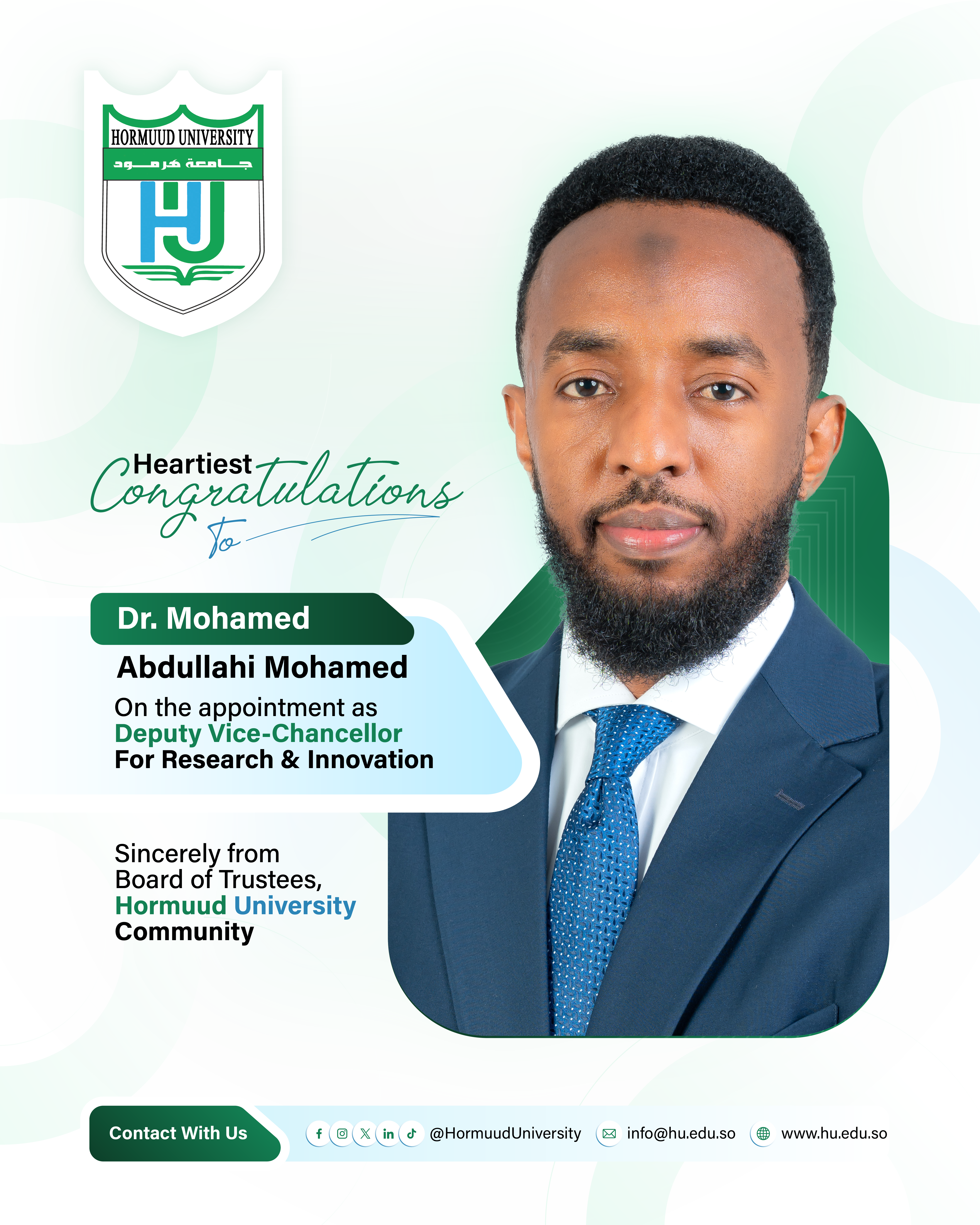 Hormuud University is pleased to announce the appointment of ๐๐ฟ. ๐ ๐ผ๐ต๐ฎ๐บ๐ฒ๐ฑ ๐๐ฏ๐ฑ๐๐น๐น๐ฎ๐ต๐ถ ๐ ๐ผ๐ต๐ฎ๐บ๐ฒ๐ฑ as Deputy Vice-Chancellor for Research and Innovation. With a strong commitment to advancing knowledge and innovation, ๐๐ฟ. ๐ ๐ผ๐ต๐ฎ๐บ๐ฒ๐ฑ will lead efforts to strengthen research culture, foster collaboration and drive academic excellence.