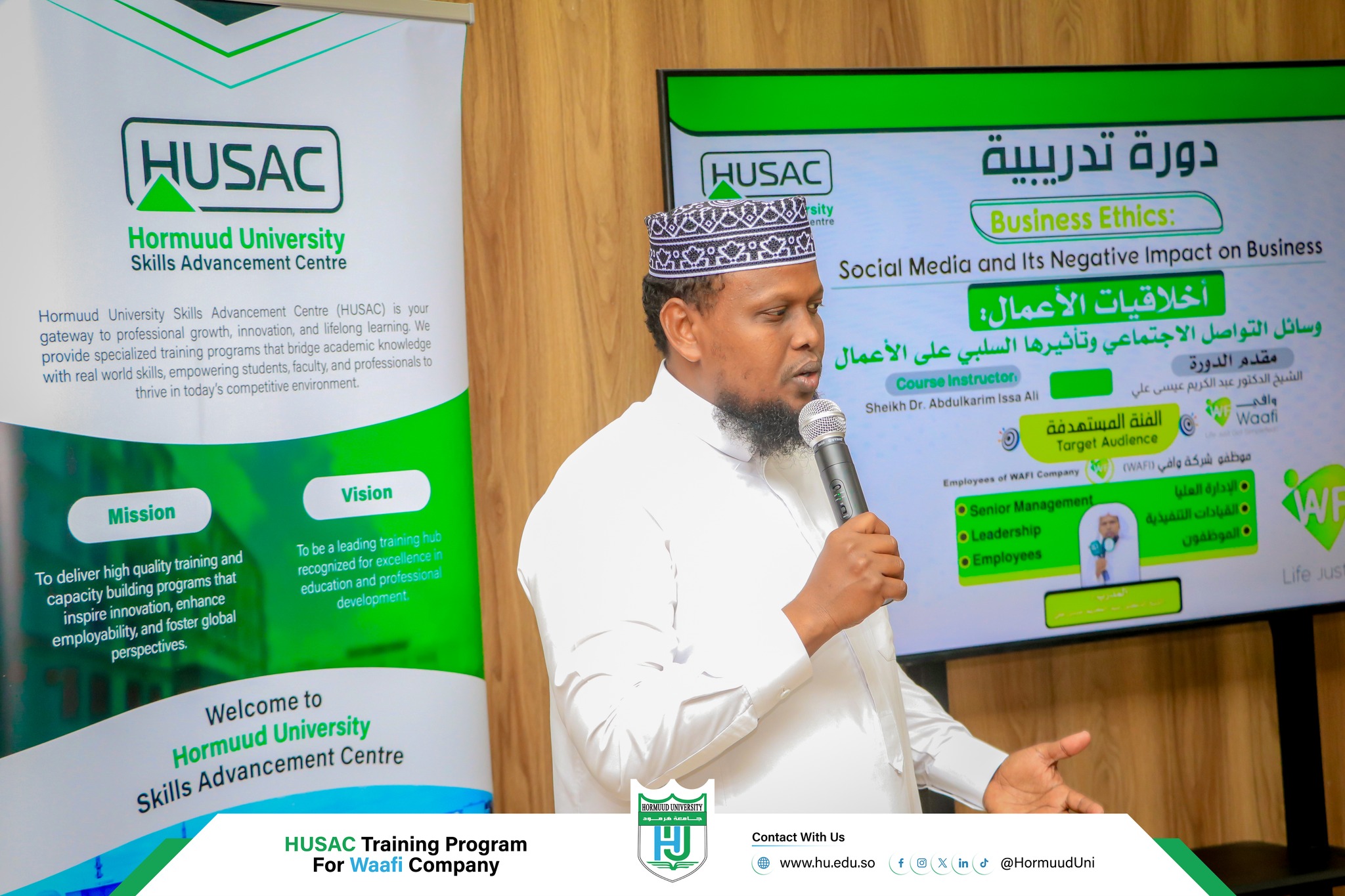 {'article_info': {'article_id': 156, 'topic': 'Business Ethics Training on Social Media Impact', 'topic_context': 'HUSAC (Hormuud University Skills Advancement Centre) trained Waafi staff on business ethics and responsible social media use.', 'author': 'Abdulkhaliq Hirsi Mohamed', 'article_category': 'EVENT', 'article_date': '2026-3-31', 'img': '618307344_1283831760442776_6544988142769651059_n.webp', 'img_orientation': 'portrait'}, 'article_content': '<div class="xdj266r x14z9mp xat24cr x1lziwak x1vvkbs x126k92a">\n<div dir="auto" style="text-align: justify;"><span class="html-span xdj266r x14z9mp xat24cr x1lziwak xexx8yu xyri2b x18d9i69 x1c1uobl x1hl2dhg x16tdsg8 x1vvkbs"><span class="xt0psk2">Hormuud University Skills Advancement Centre - HUSAC</span></span> organized a specialized training program for <span class="html-span xdj266r x14z9mp xat24cr x1lziwak xexx8yu xyri2b x18d9i69 x1c1uobl x1hl2dhg x16tdsg8 x1vvkbs"><span class="xt0psk2"><span class="xjp7ctv">Waafi</span></span></span> Company’s senior leadership, management, and employees at Holiday Hotel.</div>\n<div dir="auto" style="text-align: justify;"> </div>\n<div dir="auto"><img class="responsive-image" style="display: block; margin-left: auto; margin-right: auto;" src="../../gallery/618471066_1283834247109194_5139928186884404724_n.jpg" alt="" width="1000" height="667"></div>\n<div dir="auto" style="text-align: justify;"> </div>\n</div>\n<div class="x14z9mp xat24cr x1lziwak x1vvkbs xtlvy1s x126k92a" style="text-align: justify;">\n<div dir="auto">The training session, titled “๐๐ฎ๐ฌ๐ข๐ง๐๐ฌ๐ฌ ๐๐ญ๐ก๐ข๐๐ฌ: ๐๐จ๐๐ข๐๐ฅ ๐๐๐๐ข๐ ๐๐ง๐ ๐๐ญ๐ฌ ๐๐๐ ๐๐ญ๐ข๐ฏ๐ ๐๐ฆ๐ฉ๐๐๐ญ ๐จ๐ง ๐๐ฎ๐ฌ๐ข๐ง๐๐ฌ๐ฌ” was delivered by Sheikh Dr. Abdulkarim Issa Ali, who holds a PhD in Islamic Economy, highlighting the importance of ethical decision-making, professional integrity, and responsible use of social media in today’s business environment.</div>\n<div dir="auto"> </div>\n<div dir="auto"><img class="responsive-image" style="display: block; margin-left: auto; margin-right: auto;" src="../../gallery/619993678_1283831807109438_8429938756687778912_n.jpg" alt="" width="1000" height="667"></div>\n<div dir="auto"> </div>\n</div>\n<div class="x14z9mp xat24cr x1lziwak x1vvkbs xtlvy1s x126k92a">\n<div dir="auto" style="text-align: justify;">This initiative reflects Hormuud University’s ongoing efforts to strengthen skills development and support private-sector capacity-building in Somalia.</div>\n<div dir="auto" style="text-align: justify;"> </div>\n<div dir="auto" style="text-align: justify;"> </div>\n</div>'}