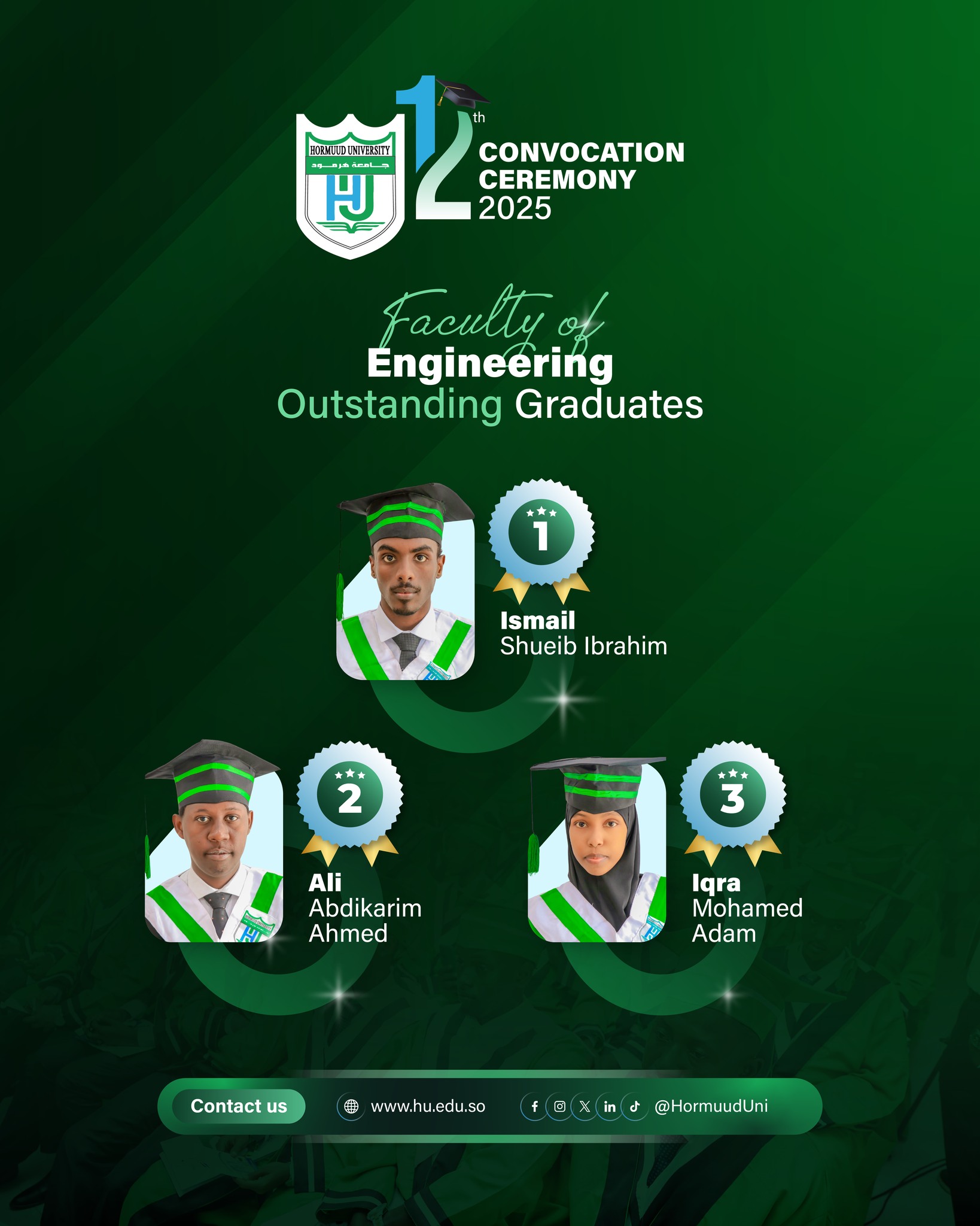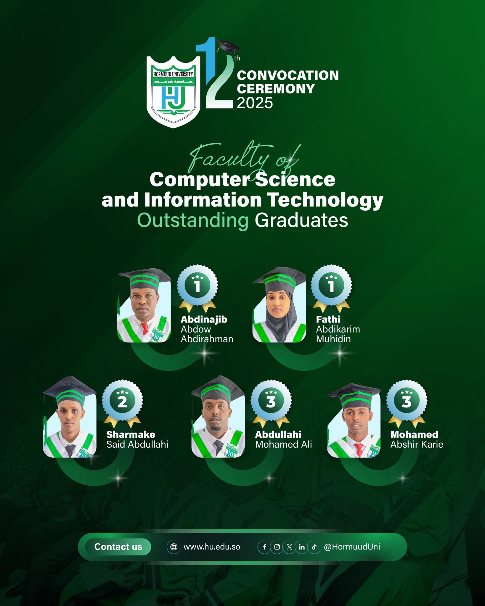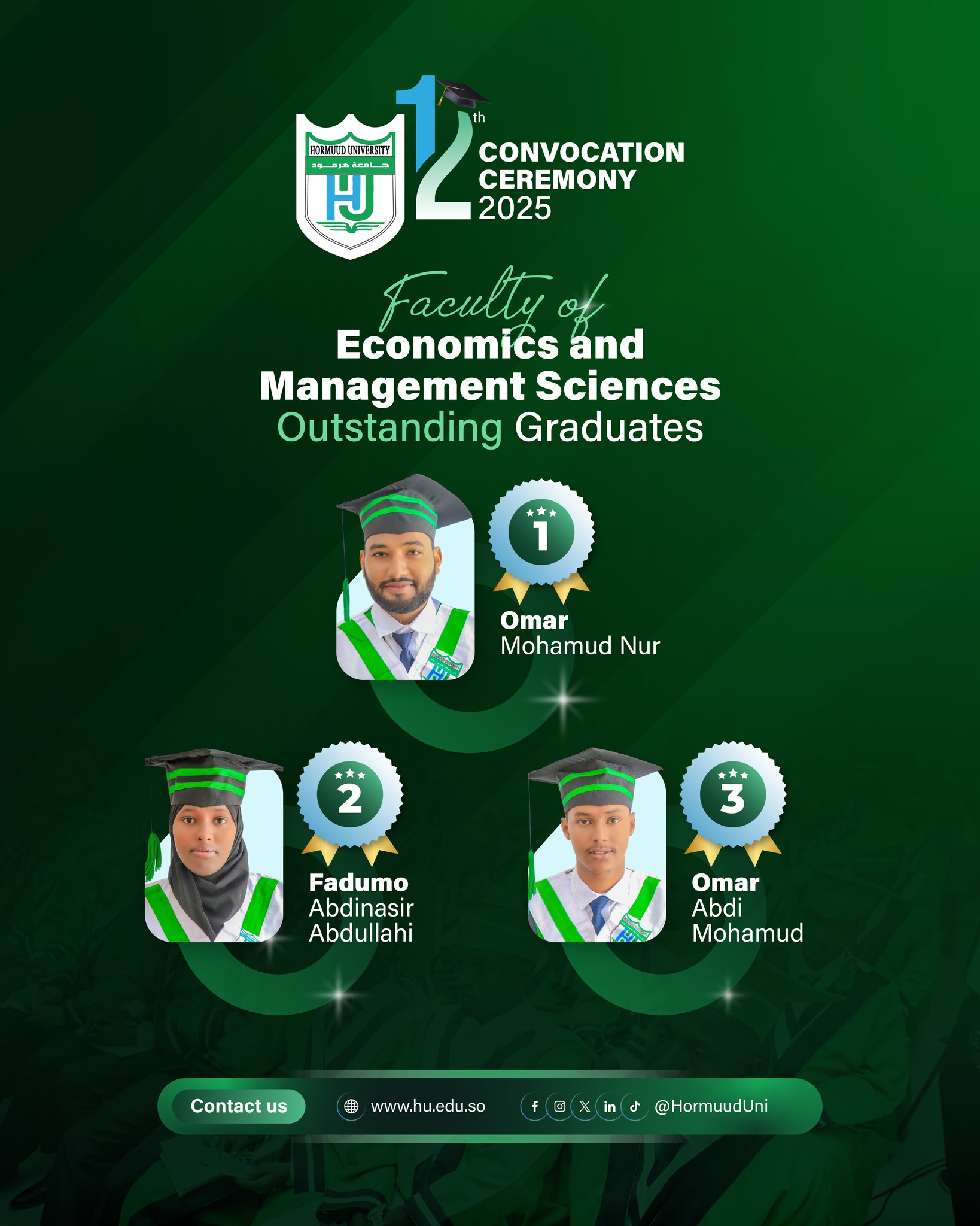 Jaamacadda Hormuud waxay hambalyo iyo bogaadin u diraysaa dhammaan ardayda ku guuleysatay kaalmaha ugu sarreeya (1aad, 2aad, iyo 3aad) ee kulliyadaha kala duwan, kuwaas oo lagu maamuusay Xafladda Qalinjabinta 12aad (Convocation Ceremony 2025).