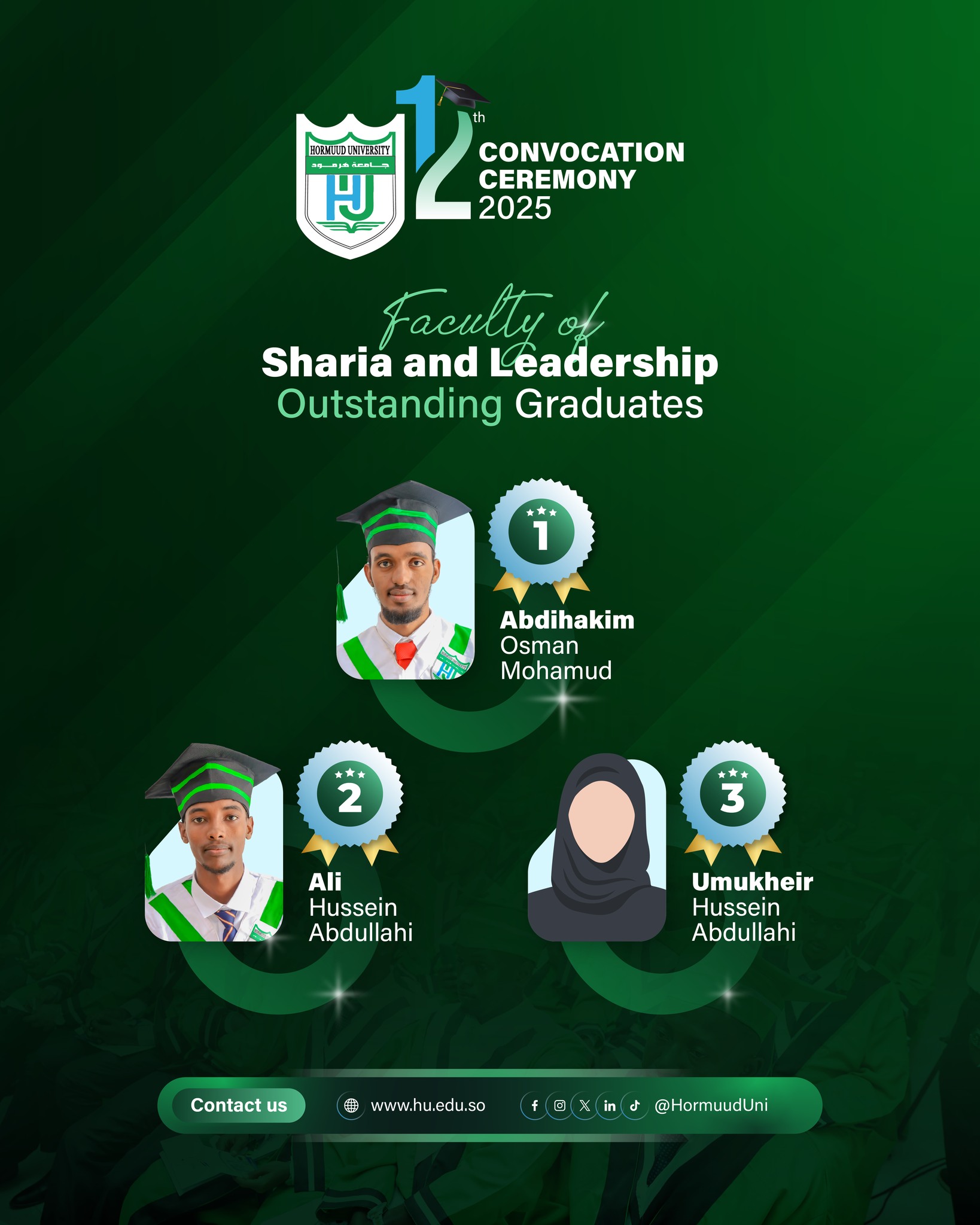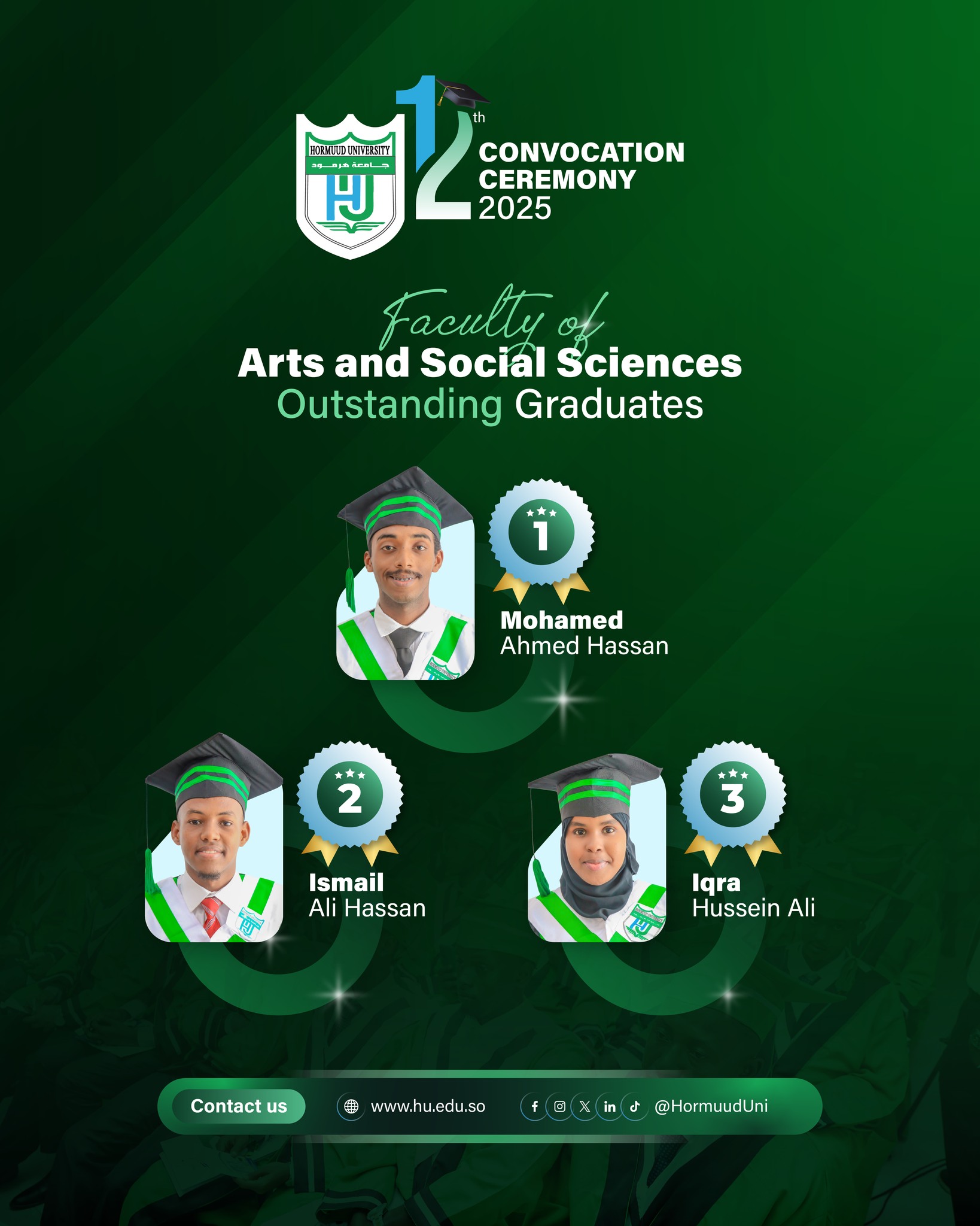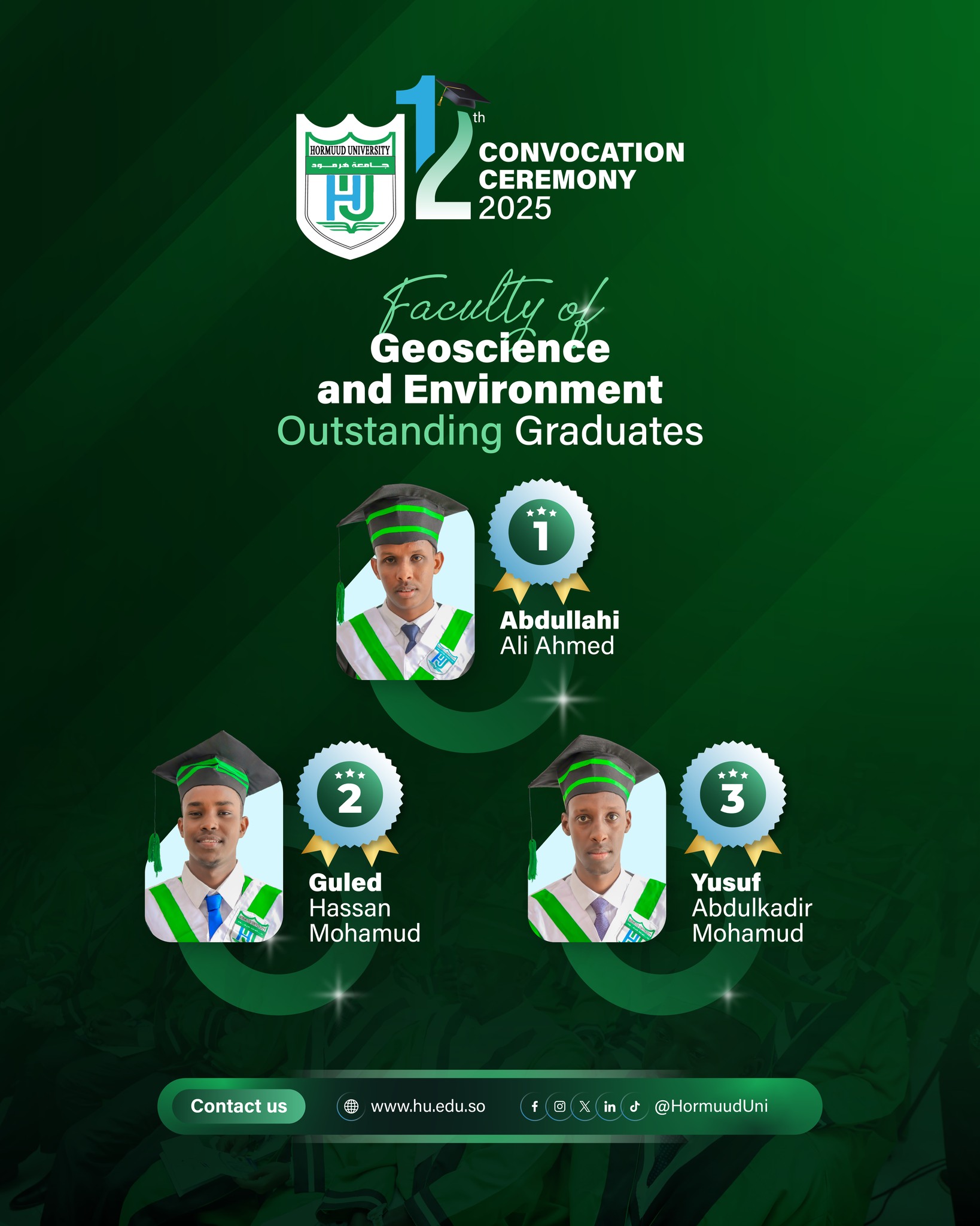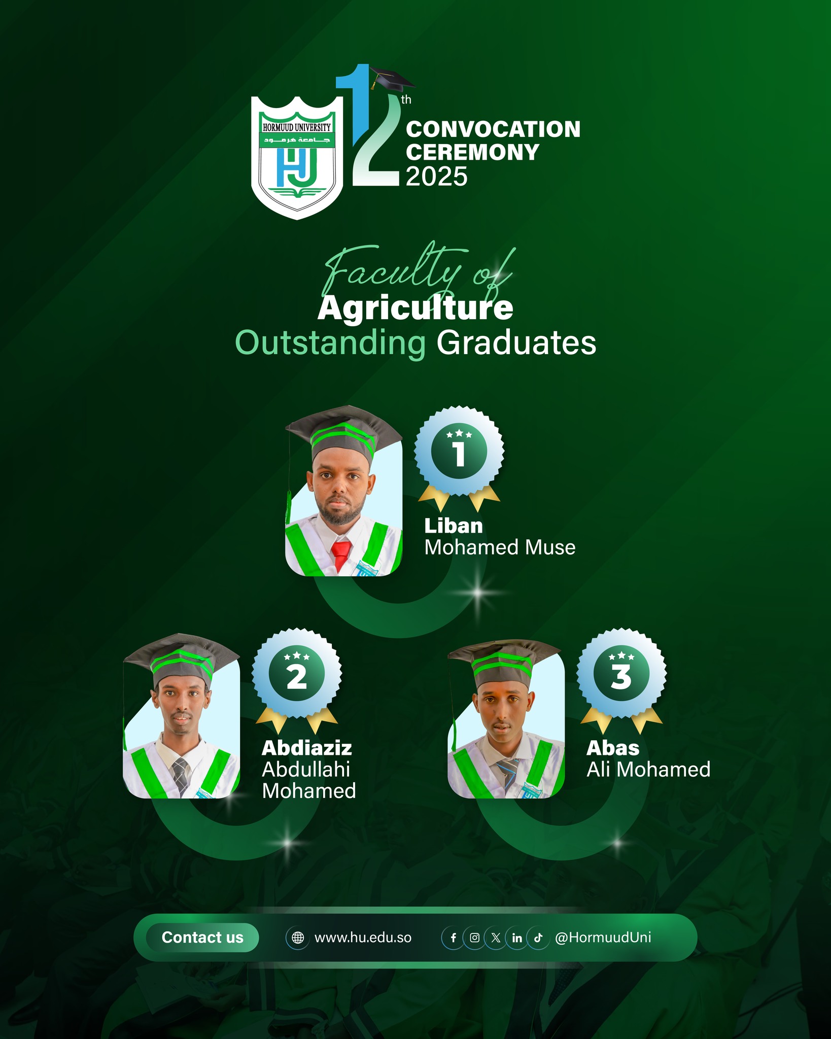 Jaamacadda Hormuud waxay hambalyo iyo bogaadin u diraysaa dhammaan ardayda ku guuleysatay kaalmaha ugu sarreeya (1aad, 2aad, iyo 3aad) ee kulliyadaha kala duwan, kuwaas oo lagu maamuusay Xafladda Qalinjabinta 12aad (Convocation Ceremony 2025).